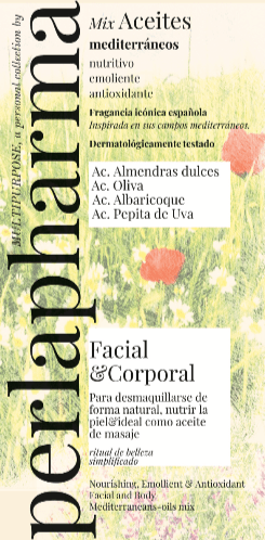En el frontal de la etiqueta tienes los principales activos y las virtudes del producto. Por lo que en este espacio te voy a explicar qué usos puedes darle a este producto tan polivalente. A nivel Facial debes aplicarlo impregnando una pequeña cantidad de producto en un algodón y con su arrastre notarás como elimina los restos de maquillaje dejando tu piel nutrida. Es recomendable el uso de nuestra Agua perfumada como tónico facial después de aplicar el aceite en la cara para terminar de limpiar en profundidad y equilibrar el efecto rico del aceite. A nivel corporal te servirá para nutrir tu piel pudiendo aprovechar para darte un masaje reconfortante para que tu piel absorba todos los beneficios de nuestros aceites mediterráneos. Notarás como deja tu piel aterciopelada con un agradable y suave aroma. Un pequeño truco: para mejorar la aplicación del aceite es mejor tener la piel un poco húmeda. A nivel olfativo este producto, como todos en nuestra línea, es una experiencia ya que tiene nuestro aroma basado en iconos olfativos españoles con un toque especial.